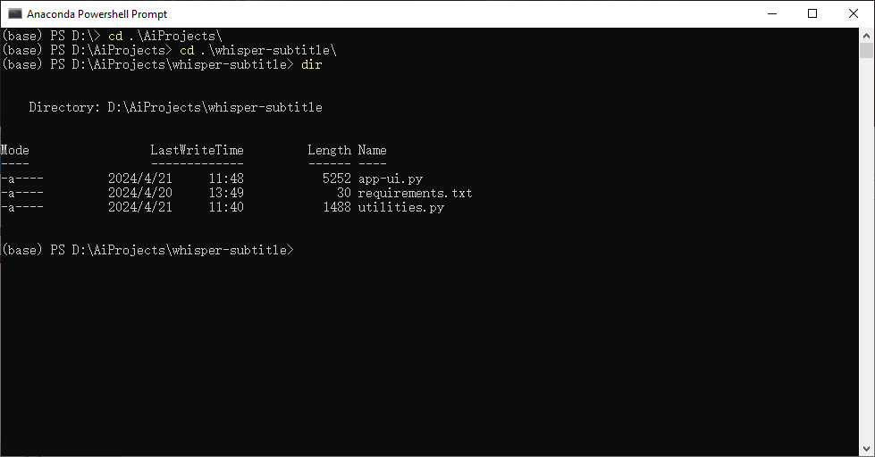 后面的操作我们在命令终端完成,我们打开Anaconda Powershell Prompt窗口(如果没有安装conda,可以直接打开Windows cmd窗口),进入我们刚刚创建的whisper-subtitle目录