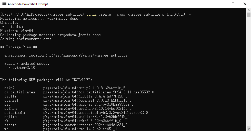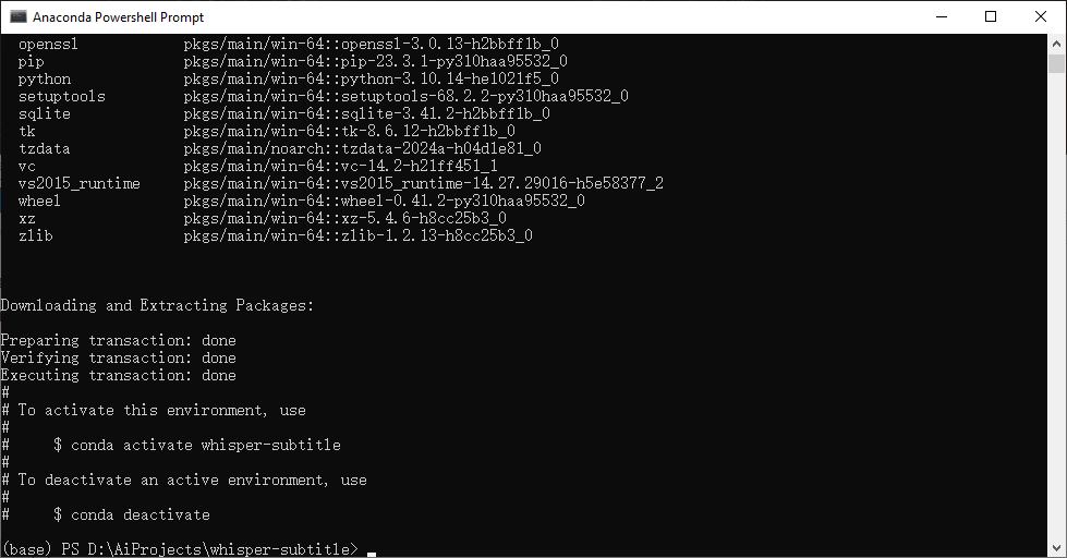 【可选】看到上面的输出,就表示虚拟运行环境创建成功,然后我们用下面的命令激活运行环境,运行后,可以看到提示符前面显示whisper-subtitle字样,就表示当前是在whisper-subtitle运行环境下执行了。(如果没有安装conda,跳过这一步)