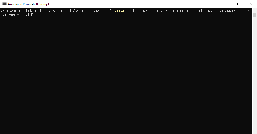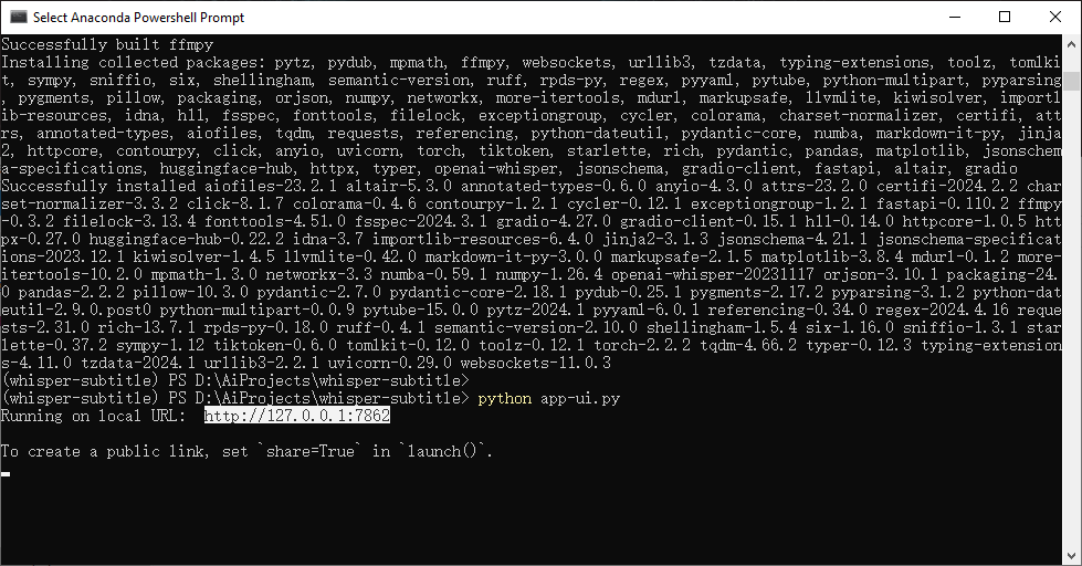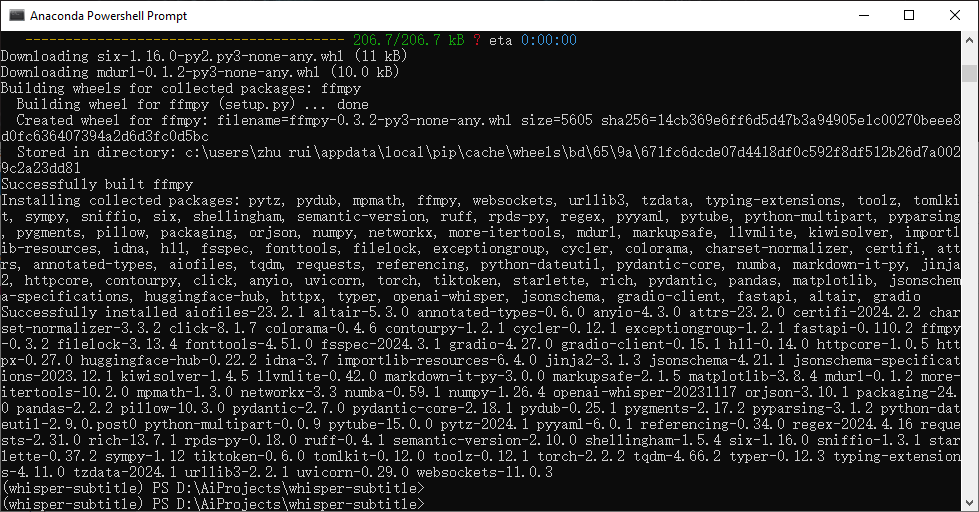 确保当前在whisper-subtitle的目录下,执行如下命令,进行程序包安装。