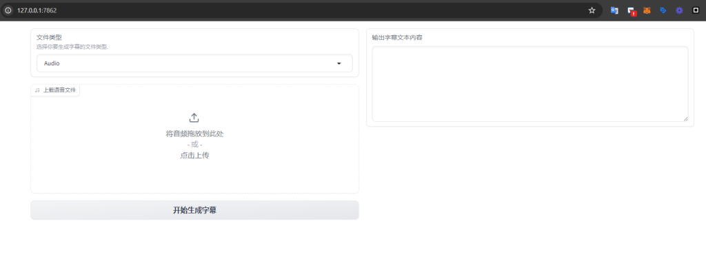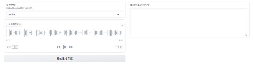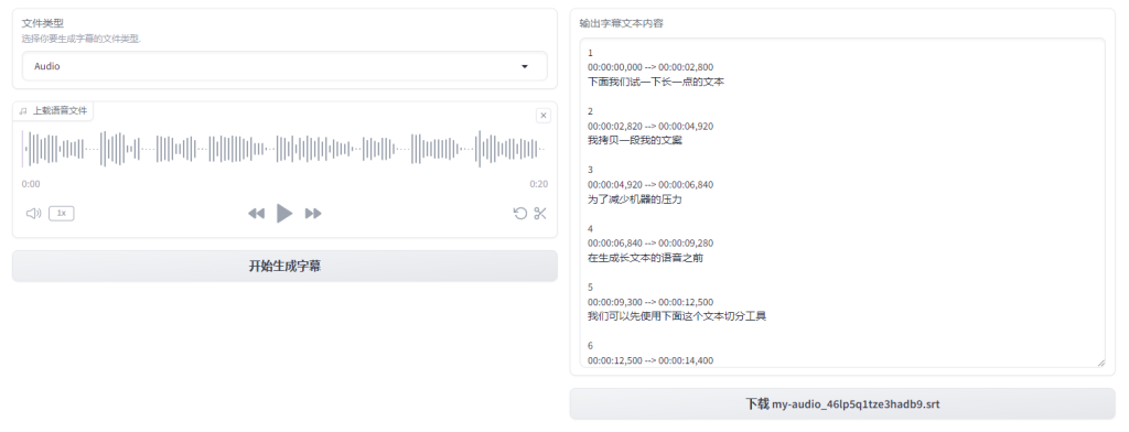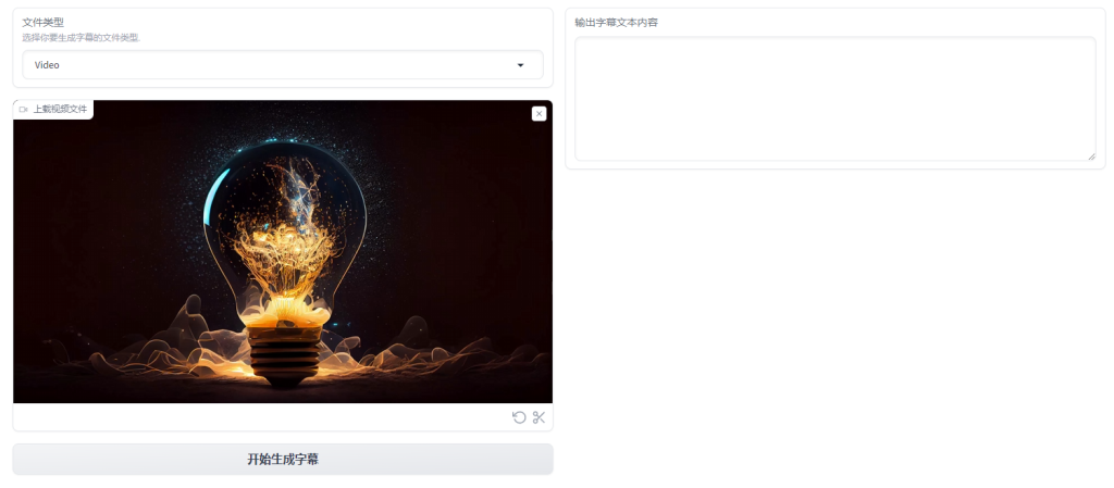 文件成功上传后,可以点击底部的“开始生成字幕”按钮,启动字幕生成。字幕生成后,在右侧的输出文本框中可以看到生成的字幕文件的内容,底部的按钮可以直接下载生成好的字幕文件。