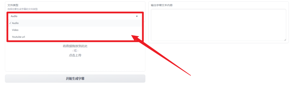 文件类型下拉框中有三个选项,分别是音频文件,视频文件,或者是youbute的视频地址,根据你要生成字幕的源文件,选择其中一种。