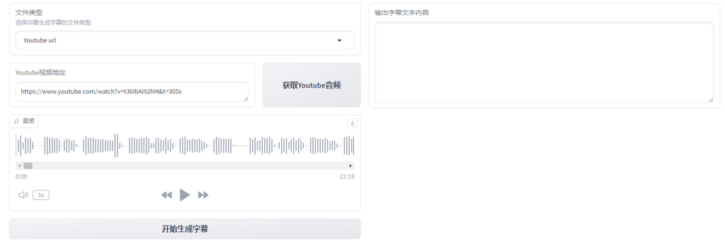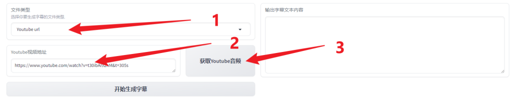 在顶部下拉框中选择Youtube url,然后在youtube url录入框中输入你要生成字幕文件的视频地址,然后点击“获取Youtube音频”按钮