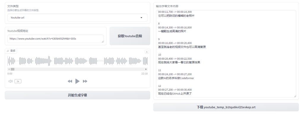 做自媒体,在各个平台发布视频,制作字幕是一直都是一件非常费时费力的工作。不管你是做内嵌的字幕,还是外挂字幕,都需要花费较长的时间。所以我花了几天的时间,以OpenAi的Whisper模型为基础,利用Gradio自己开发了一个AI小工具。可以自动识别语音文件或者视频文件,并自动生成srt字幕文件。甚至可以直接通过youtube的视频链接,生成字幕。