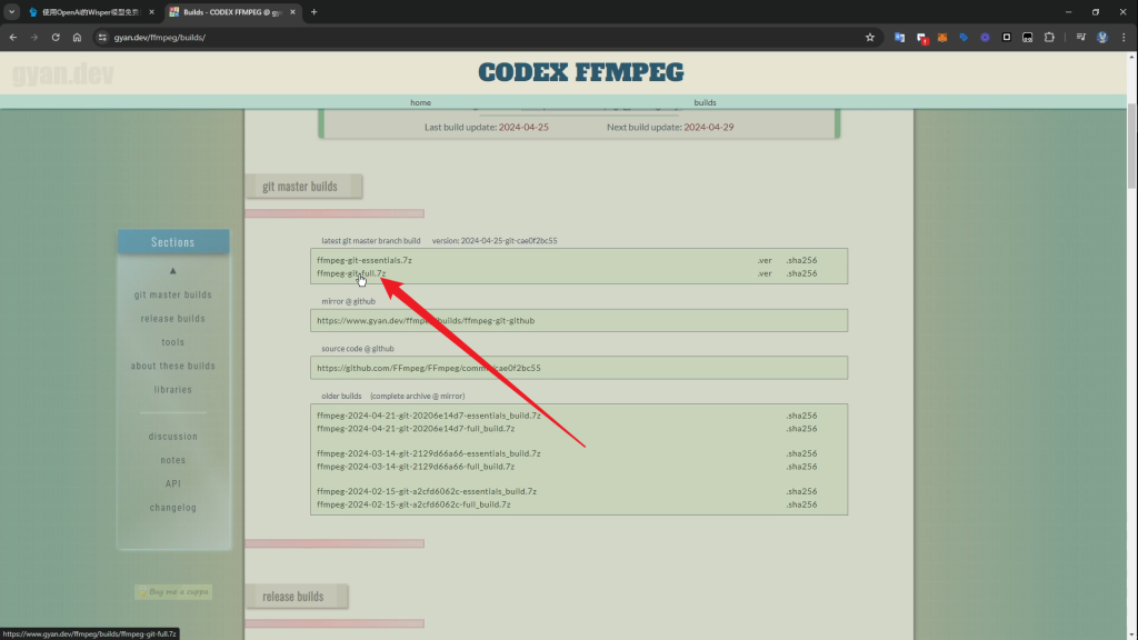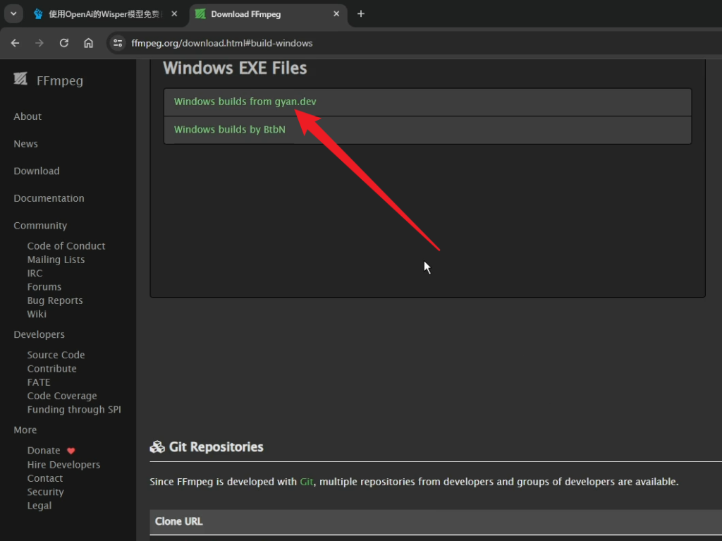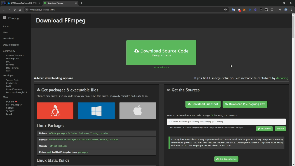 因为项目需要用到开源多媒体管理工具,因此需要先安装ffmpeg,我前往ffmpeg官网进行下载【ffmpeg/download.html