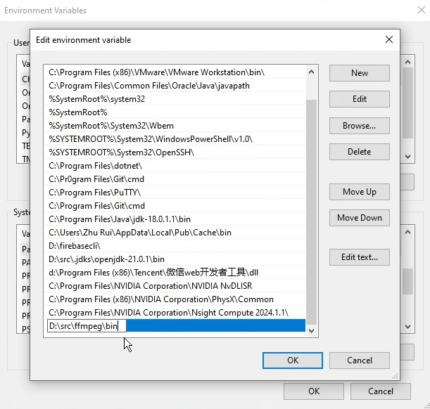 把下载的文件解压到你想要存放ffmpeg的目录当中。然后将ffmpeg/bin目录添加到windows的path环境变量当中